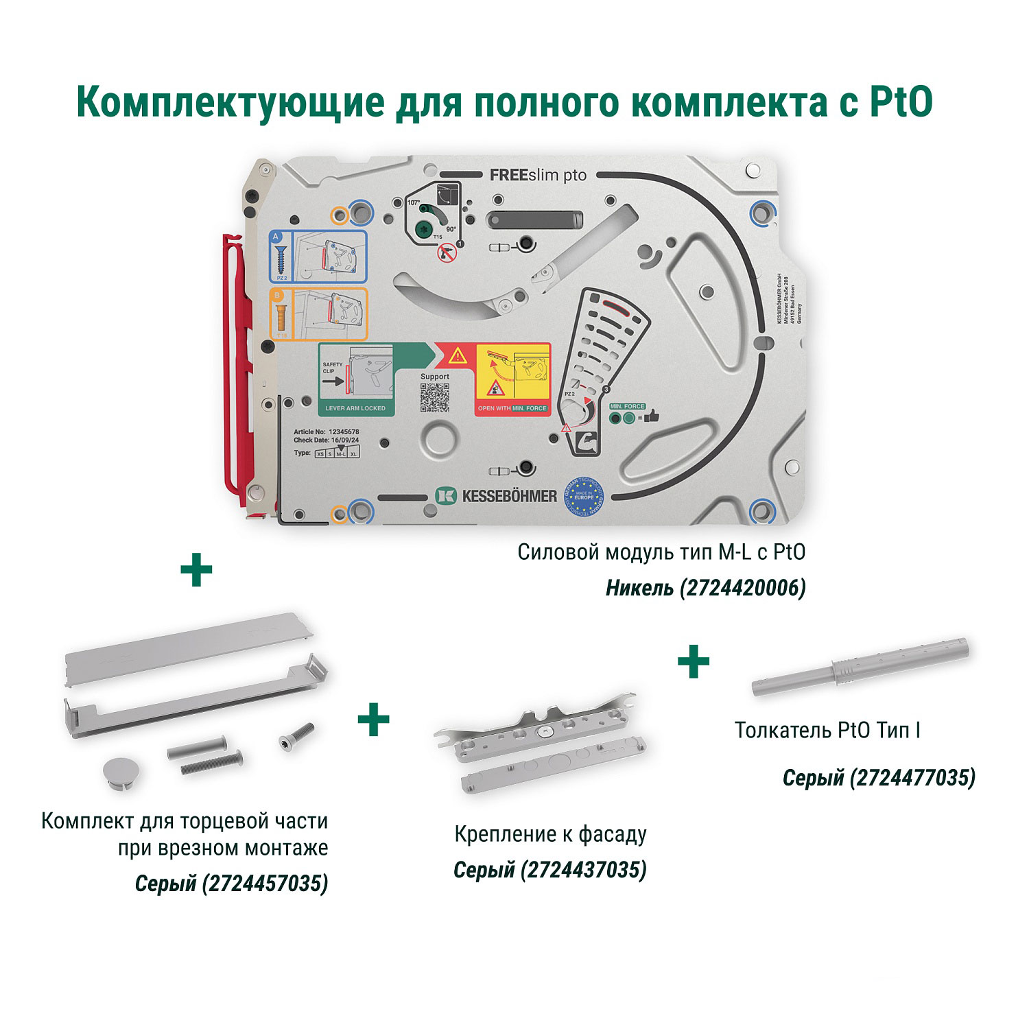 Полный комплект ультратонкого подъемного механизма ФриСлим ФЛАП Kesseböhmer c толкателем PTO тип I для врезного монтажа, цвет СЕРЫЙ