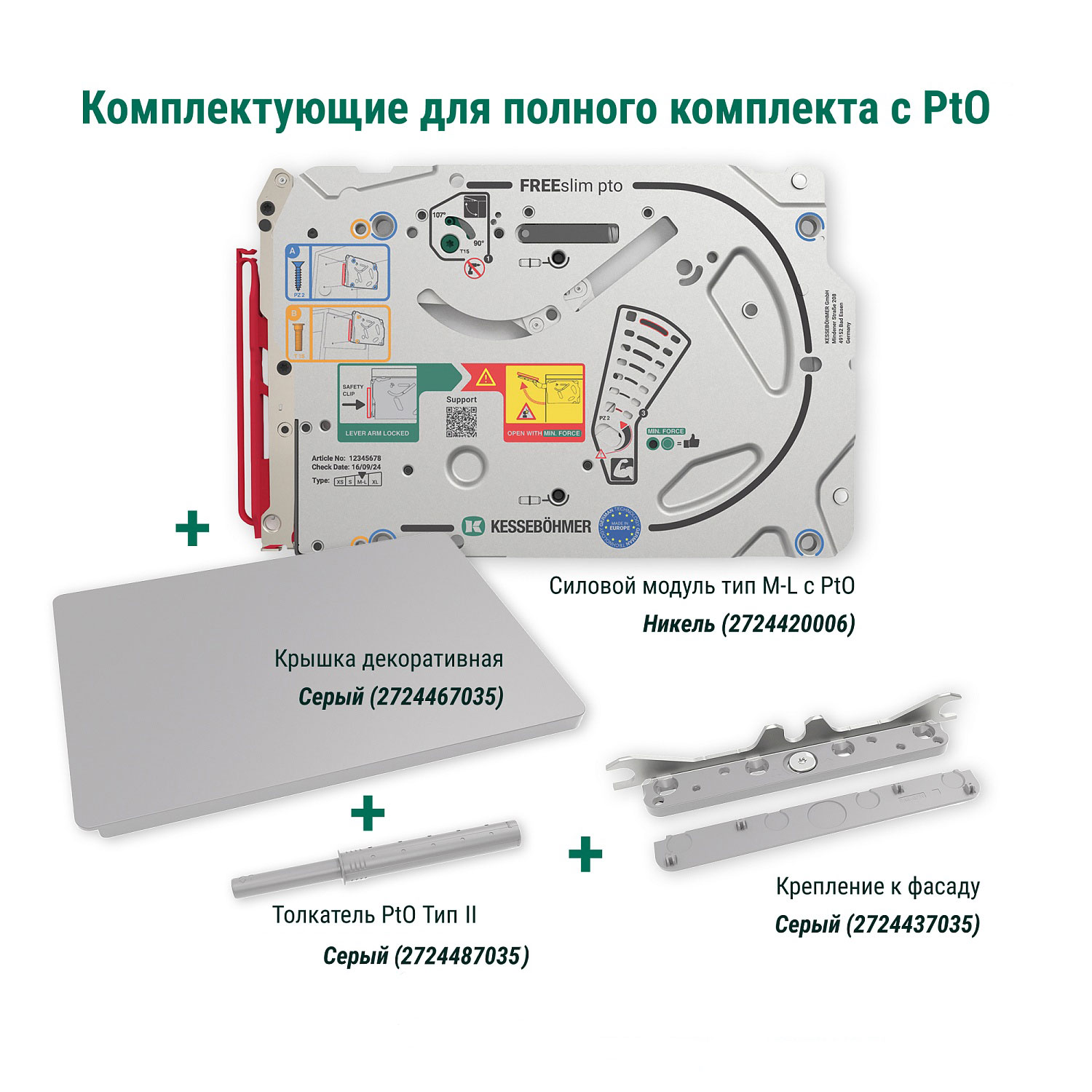 Полный комплект ультратонкого подъемного механизма ФриСлим ФЛАП Kesseböhmer c толкателем PTO тип II для накладного монтажа, цвет СЕРЫЙ