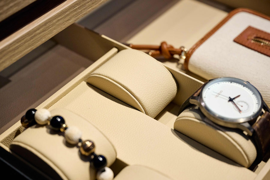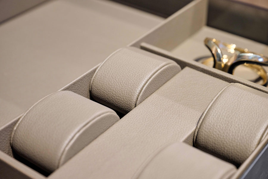 Кожаные вставки для выдвижных ящиков. Вкладыши из флока для ящиков и полок Conero будут дополнены новинками из искусственной кожи. Вкладыши универсальные, для ремней, часов, колец будут представлены в двух цветах - песочный бежевый и коричневая норка. Мягкая поверхность защищает аксессуары от царапин и повреждений. В зависимости от ширины ящика вкладыши могут быть скомбинированы друг с другом, вы создадите свое уникальное пространство для хранения ваших аксессуаров.